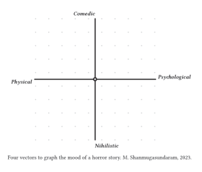 In Dead of Night , I posited that horror is often presented across two vectors: physical and psychological. Two additional vectors didn’t make it into the book: nihilism and comedy. Using these four descriptors, you can graph the flavor of any horror story: